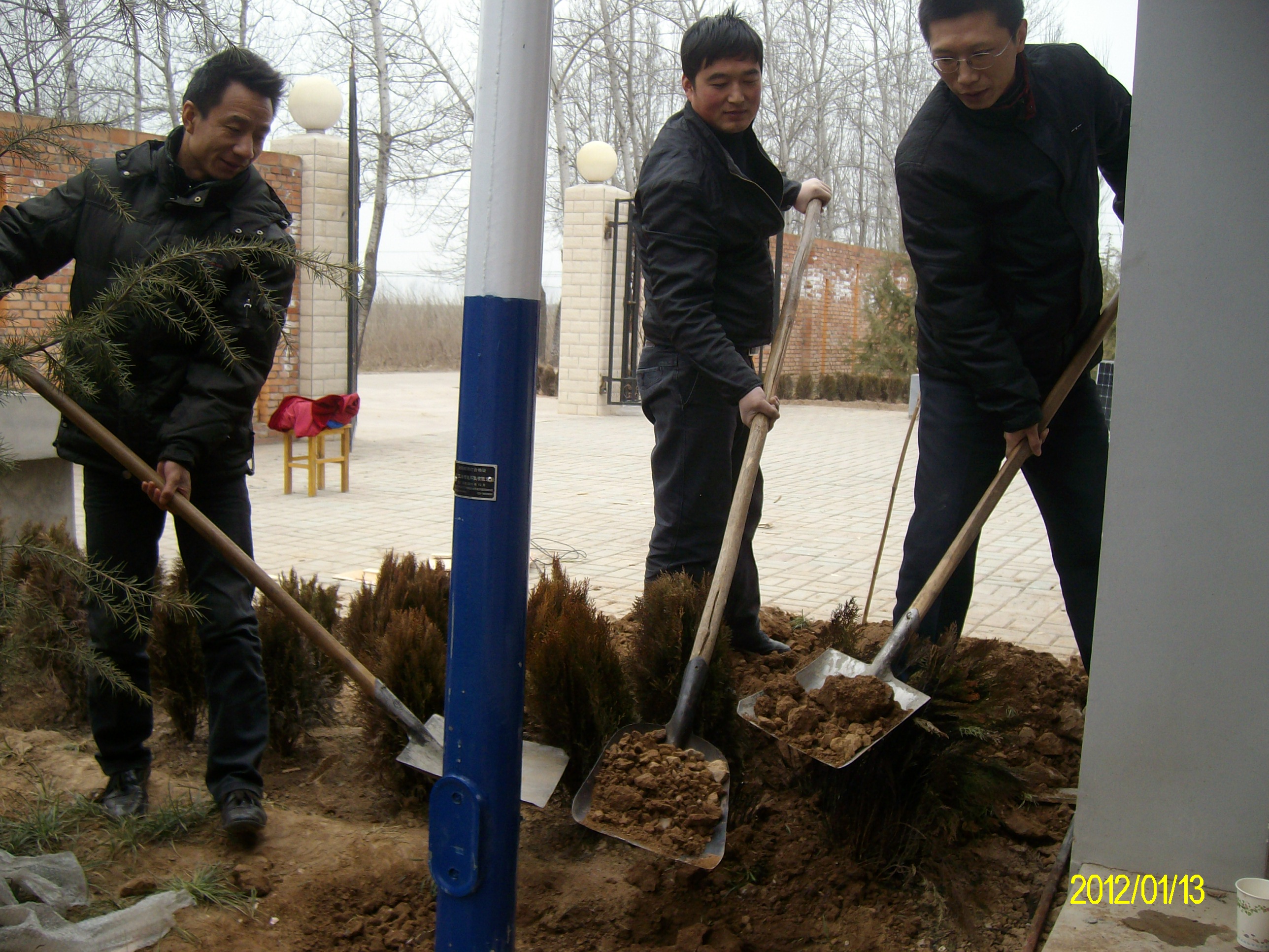 校長、 總工、技術(shù)人員一起豎立路燈